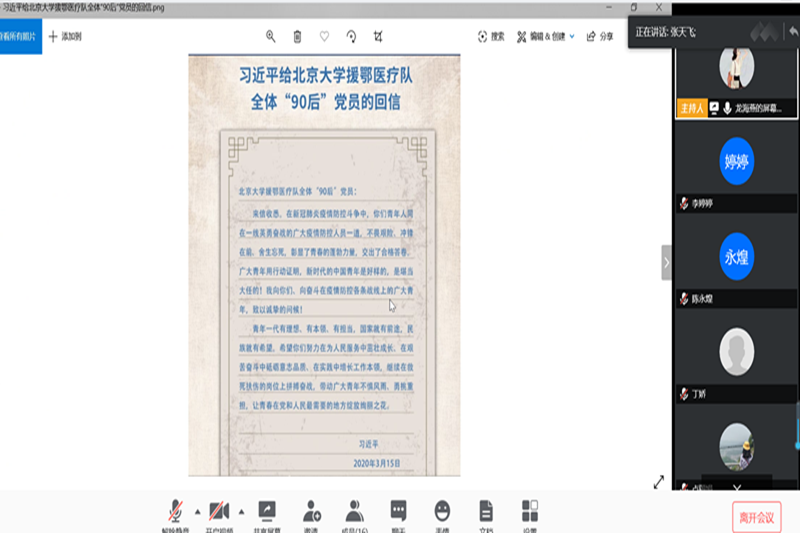 随后,组织委员张天飞诵读了习近平总书记给北京大学援鄂医疗队全体“90后”党员的重要回信内容。习近平总书记在回信中写道:“广大青年用行动证明,新时代的中国青年是好样的,是堪当大任的!”回信内容充分肯定了“90后”党员为抗疫斗争做出的贡献和牺牲,并激励着广大青年勇挑重担,为打赢疫情防控阻击战贡献力量,让青春在党和人民最需要的地方绽放绚丽之花!回信精神让学院青年教师倍感振奋、备受鼓舞。龙海燕并倡议所有党员“谈体会、话担当”,通过“说”、“唱”、“写”、“拍”等多种载体形式,在支部工作群内分享学习,弘扬主旋律,传播正能量。党员同志积极参与,有“湖北不怕,家在华夏!国宝驰援,为武汉加油!”、“抗疫护士妈妈善意的谎言”的小视频、“热干面加油”的漫画、“逆行者”的卡通图和张文宏被采访发言等等,旨在向党支部全体同志传递正能量。