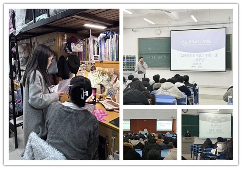 为进一步深化大学生思想政治教育工作,引导青年学子以饱满热情、昂扬姿态开启新学期新征程,电气与电子工程学院精心策划并开展新学期“开学第一课”主题教育系列活动。学院聚焦学生成长发展需求,创新活动形式,通过主题班会、宿舍走访调研、师生一对一谈心谈话等多样化载体,构建起全方位、多层次的思政教育矩阵。辅导员围绕“诚信教育课”主题,结合开学补考开展考风考纪警示教育,通过典型案例强化学生诚信意识,营造优良考风;“安全教育课”聚焦防诈骗,详解诈骗特点与作案手法,普及防范常识与技巧,切实提升学生反诈识别和自我保护能力。同步融入“爱校荣校教育”,组织学生感悟校园文化底蕴,传承信工精神,引导学子以实际行动维护学校声誉、践行青年担当。(图为开学第一课系列活动照片)在“树立目标课”上,辅导员结合案例分享,帮助学生树立正确择业观,鼓励参与职业规划大赛,引导制定个性化学业与人生规划。此外,辅导员逐一走访学生宿舍开展安全隐患拉网式排查,同步做好日常安全提醒;常态化开展一对一谈心谈话,精准关切各类特殊学生群体的思想动态与