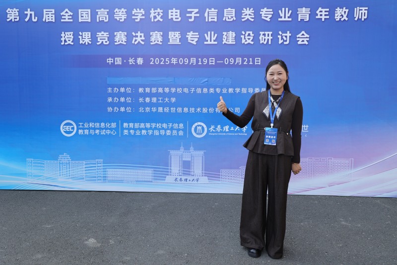 近日,由教育部高等学校电子信息类专业教学指导委员会主办,长春理工大学承办,北京华晟经世信息技术股份有限公司协办的第九届全国高等学校电子信息类专业青年教师授课竞赛决赛中,我校李津津老师荣获国家二等奖。(图为第九届全国高等学校电子信息类专业青年教师授课竞赛决赛暨专业建设研讨会)本届大赛立足新时代高等教育改革方向,紧扣“立德树人”根本任务,以“课程思政”为引领,注重人工智能与教学创新的深度融合。赛事覆盖全国四大赛区,吸引28个省区市197所高校的696名教师参赛,充分展示电子信息领域教学改革与师资建设的新成果。经严格选拔,273名优秀教师晋级全国决赛。决赛特邀7位国家级教学名师、44位省级教学名师及教指委委员组成评委会评审,对参赛教师现场教学内容、教学设计、智慧教学、教学特色、教学效果等方面进行综合打分。最终李津津在与众多名校的激烈角逐以优异的表现荣获佳绩。。(图为李津津参赛)(图为颁奖现场,右四为李津津)我校将以本次大赛为契机,持续大力推动教师发展,深化教育教学改革,不断提升教师教书育人水平