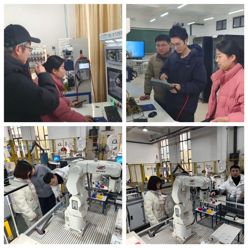 为确保新学期机器人工程专业实践课程顺利开展,进一步提升实验教学设备对产业需求与项目式教学的支撑能力,近日,电气学院机器人工程专业教研室组织全体教师,对学院A8103仿真实训室与A4S101综合机器人实验室的设备运行状态进行了系统性、分组的详细摸排与记录。作为学院开展“机器人建模与仿真”及“工业机器人编程与应用”等核心课程,以及承接多项校企合作挑战实践项目的重要教学与创新平台,A8103与A4S101两个实验室的设备使用频率高、承载教学任务重。为确保这些宝贵资源在教学与创新能力培养中持续发挥关键作用,教研室本次工作重点聚焦于设备软硬件的协同状态、耗材储备及课程操作流程的优化,旨在通过提前发现、科学记录、协同反馈,建立常态化的设备健康维护机制,最大限度地保障教学进程顺畅与学生实践体验。在排查过程中,朱主任和邵副主任牵头将教研室成员分为两组,结合各自负责的课程模块,对设备进行了细致检测与实操验证。在A8103仿真实训室,教师们重点核对了五台仿真实训台的运行精度、控制系统稳定性及安全设施完备性,