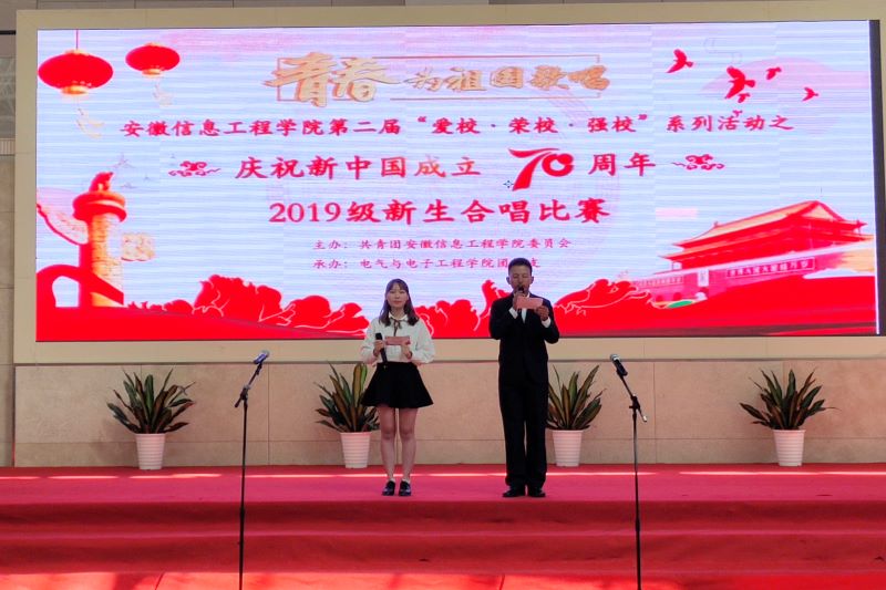 2019年9月20日14时,安徽信息工程学院第二届 “青春为祖国歌唱”2019级新生合唱比赛在体育馆三楼精彩上演。安徽信息工程学院校长吴敏,副校长陈跃东、葛付才、程业涛,学生处处长吴晓,电气与电子工程学院院长章敏凤、副院长陈坚伟、孙惠玲参加比赛现场。学生处副处长、团委书记陈振,电气与电子工程学院团总支书记华静,机械工程学院团总支书记王淼昕,管理工程学院团总支书记张婷婷,艺术设计学院团总支书记金亮,通识教育与外国语学院学生会指导老师涂遥,大学生艺术团指导老师曹栋应邀担任比赛评委。来自各学院共七支队伍参加此次决赛,参赛的各队伍着装统一,用激昂的歌声奏响青春梦想的旋律,用深切的情感庆祝新中国成立七十周年的生日。艺术设计学院带来的《东方红》拉开了比赛的序幕,幕起而红日升,为人民谋福利的毛泽东,引领我们在道路上前行,歌声的悠扬让我们穿越了祖国七十周年的风雨历程;管理工程学院带来的《游击队之歌》与《长城谣》牵引我们的思绪穿过高山密林,趟过河流弹雨走进那个没枪没炮敌人来造的艰苦时代,感受革命先辈的视死
